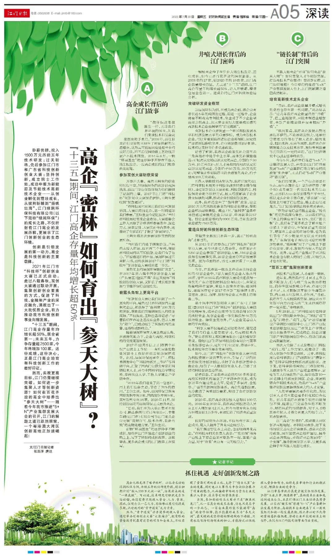 臥薪嘗膽,投入1500萬元?dú)v經(jīng)五年技術(shù)研發(fā);過關(guān)斬將,先后參加江門市和廣東省科技創(chuàng)新創(chuàng)業(yè)大賽;堅(jiān)持創(chuàng)新,成立院士工作站,成功申報(bào)為新能源及節(jié)能技術(shù)高新技術(shù)企業(yè)……從創(chuàng)業(yè)孵化到茁壯成長,從披荊斬棘到“揚(yáng)帆出海”,江門綠潤環(huán)??萍加邢薰荆ㄒ韵潞喎Q“綠潤環(huán)保”)的成長之路,不僅折射著江門高企的發(fā)展歷程,更展示了江門創(chuàng)新創(chuàng)業(yè)的生態(tài)環(huán)境。創(chuàng)新是引領(lǐng)發(fā)展的第一動力,高企是科技創(chuàng)新的主要載體。