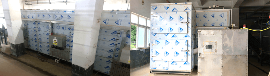 工作流程:濕泥叉車上料→5噸暫存料斗→皮帶輸送機(jī)→低溫?zé)岜酶苫到y(tǒng)(3套48HP熱泵模塊)→螺旋機(jī)出料→干泥裝噸袋外運(yùn)