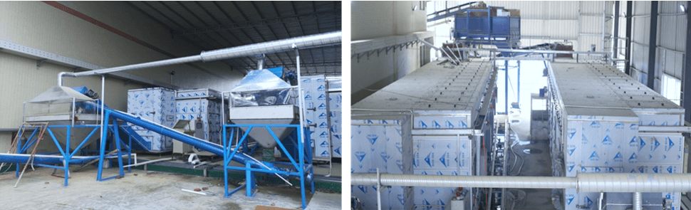 工作流程:濕泥叉車(chē)上料→10噸暫存料斗→皮帶輸送機(jī)→低溫?zé)岜酶苫到y(tǒng)(2條5×48HP熱泵模塊)→出料稱(chēng)重→皮帶輸送機(jī)→提升機(jī)→100立方干泥料倉(cāng)裝車(chē)外運(yùn)