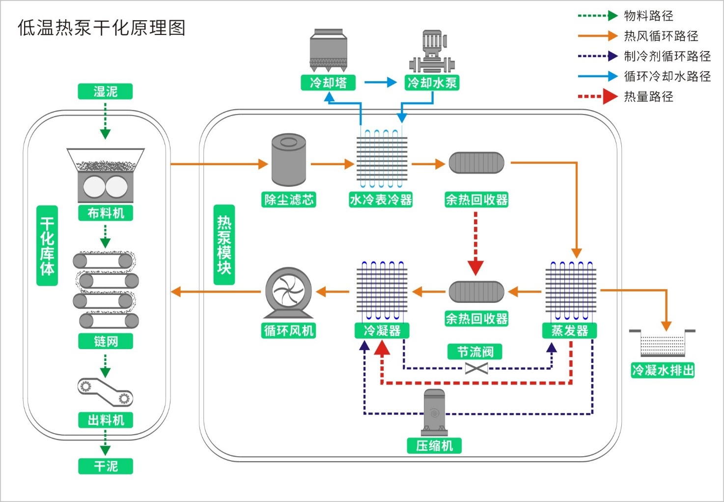 1、獨(dú)立風(fēng)道設(shè)計,循環(huán)熱風(fēng)在干化庫體內(nèi)流轉(zhuǎn),不接觸直接接觸熱泵模塊核心設(shè)備,有效隔絕腐蝕性氣體對核心設(shè)備的損壞